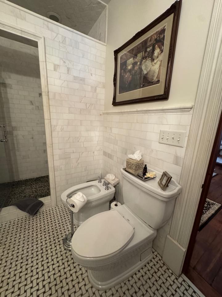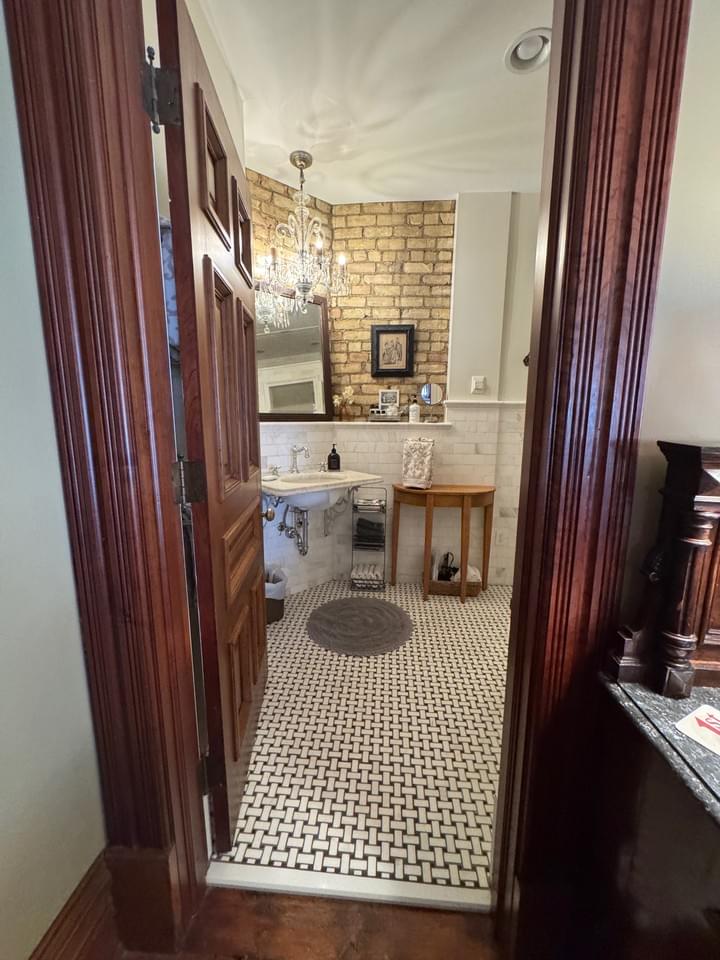 Luxuriously appointed with brick and marble - a shower for two, heated tile flooring, a bidet - and a chandelier!
