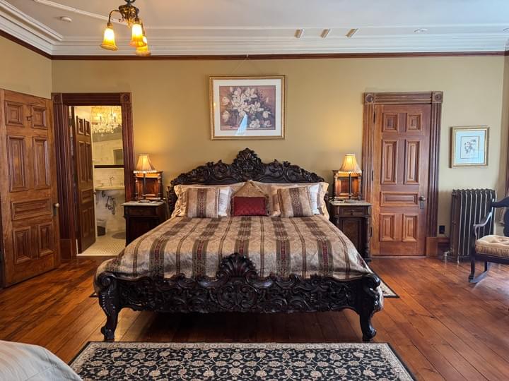 A beautiful blend of old and new: an antique clawfoot tub and a modern shower and heated floor. This bathroom is shared with our Charlotte Room.
