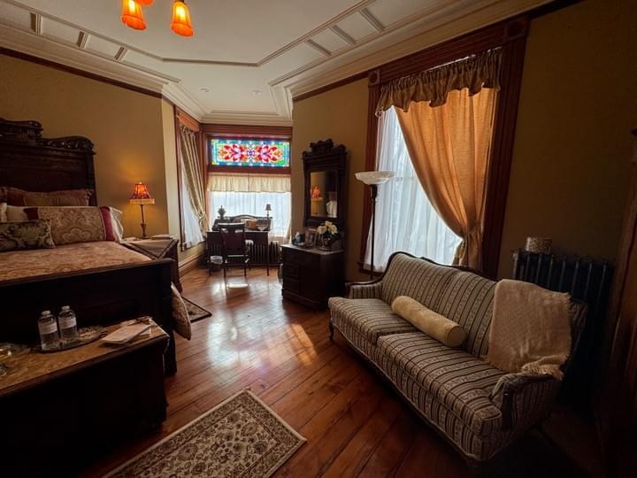 A beautiful blend of old and new: an antique clawfoot tub and a modern shower and heated floor. This bathroom is shared with our Dickens Room.